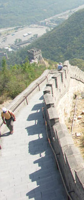 Po opuszczeniu doliny grobowców autokar skierował się do BADALING, gdzie jest udostępniony zwiedzającym położony najbliżej Pekinu fragment Wielkiego Muru Chińskiego. Wielki Mur swoje początki datuje około VI wieku p.n.e., kiedy to lokalni władcy wysuniętych na północ fragmentów przyszłego imperium postanowili zabezpieczyć się od napadów ludów północnych z plemienia HUN, budując pierwsze fragmenty muru obronnego, który w III w p.n.e. pierwszy cesarz Chin, QUIN SHI HUANG DI, postanowił połączyć w ciąg fortyfikacji . Początkowo przy budowie pracowało około 300 tysięcy ludzi, ale w miarę postępu prac i powiększania ich zakresu liczba ta sięgnęła 3,5 mln, co stanowiło blisko 70% ludności ówczesnego cesarstwa. Katorżnicza praca w skrajnie niekorzystnych warunkach, głównie w wysokich i niedostępnych górach, spowodowała śmierć około 1 mln budowniczych. Wielki Mur łączy szczyty wysokich gór, które pokrywają większość terenu Chin, a jego obecny kształt zawdzięczamy cesarzom dynastii MING, którzy z dużą konsekwencją wyremontowali go i odbudowali. Obecnie Chiny ponownie odnawiają zniszczony w wielu miejscach Wielki Mur, który uznawany jest za jeden z cudów świata i podobnie jak Zakazane Miasto , Plac TIANNANMEN i Świątynia Nieba został wpisany na Listę Dziedzictwa Kultury Światowej UNESCO.