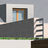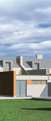 Zaprojektowane budynki łączą w sobie zalety zabudowy szeregowej (daleka perspektywa ogrodu przy stosunkowo niewielkiej działce) i atrialnej (odizolowane od odtoczenia wewnętrzne patio). Udało się przy tym wyeliminować wady występujące w tych rodzajach zabudowy takie jak brak możliwości wejścia (wjechania) na tył domu i niedostateczne odizolowanie akustyczne tarasu i wnętrza domu od sąsiadów. Zabudowa składa się z dwóch typów domów.