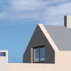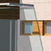 Ściany zaprojektowano z ceramicznych pustaków Porotherm. Elewacja pokryta zostanie bardzo trwałymi płytkami Stoer, a w miejscach, gdzie często przebywają mieszkańcy (taras, wejście do budynku) okładziną z drewna egzotycznego. Stolarka na zasadzie kontrastu w "miękkiej", drewnianej części elewacji będzie aluminiowa, natamiast w "twardej", ceramicznej drewniana. Zasada kontrastu dotyczy też pokryć dachowych. Ponieważ założeniem projektantów było ścisłe powiązanie wnętrza domu z otoczeniem, większość pomieszczeń zaprojektowano na parterze i przekryto dachem płaskim. Aby zapewnić dodatkową izolację i ciekawy widok z okien piętra, zastosowano tu system dachów zielonych. Dla kontrastu na dachach pochyłych zastosowano pokrycie z płaskich blach tytanowych.