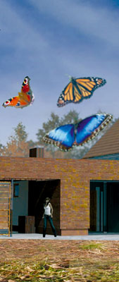 Prezentowany domek jest zaprzeczeniem nadmiernie "nadętej" postawy. Prosta, ponadczasowa architektura nie podlega modzie i nigdy się nie opatrzy. Klarowne powi±zania funkcjonalne nie wymagaj± omówienia. Od strony wjazdu działka s±siaduje z zalesionym jarem, który widać z okien kuchni i poddasza. Ze względu na potrzebę zabezpieczenia pokoi położonych na piętrze przed nadmiernym przegrzewaniem się w lecie, okna połaciowe skierowano na stronę słabiej nasłonecznion±. Widok o¶wietlonych koron drzew w godzinach popołudniowych rekompensuje mieszkańcom brak słońca w tych pomieszczeniach. Osłonięty przez skrzydła budynku, dobrze nasłoneczniony taras dostępny jest z pokoju dziennego i sypialni gospodarzy. Roztacza się st±d widok na ogród. Ciekaw± propozycję stanowi zadaszenie przylegaj±ce do niższego skrzydła domu. W lecie stanowi ono zacienion± czę¶ć tarasu, zim± za¶ może pełnić rolę schronienia dla drugiego samochodu.