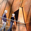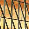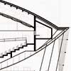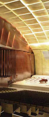 Kamienna okładzina zawija się również na wewnętrzne ściany "bariery akustycznej". W pomostach wprowadzono czterdziestocentymetrowe pasy szkła, oddzielające je optycznie od ścian prostopadłościennego zewnętrznego bloku pomieszczeń pomocniczych i doświetlające przestrzeń poniżej; również balustrady posiadają wypełnienia ze szkła.